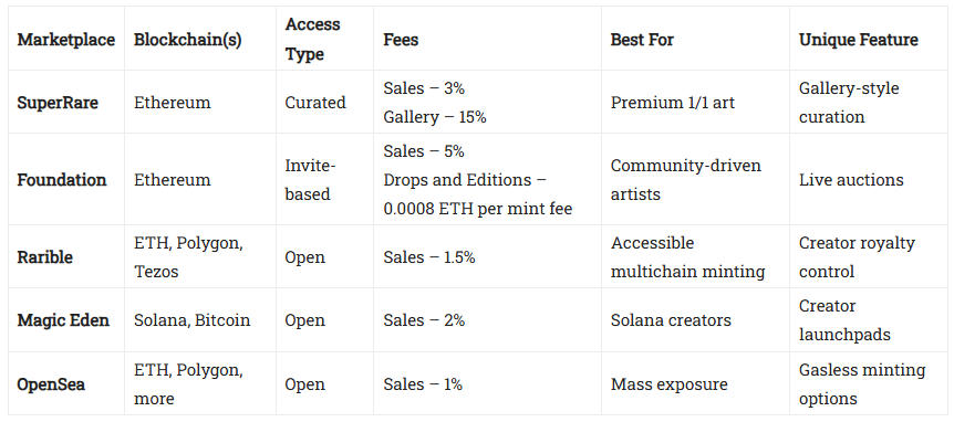 该表格根据艺术家的需求和区块链偏好,快速概览比较了最适合艺术家的NFT市场。