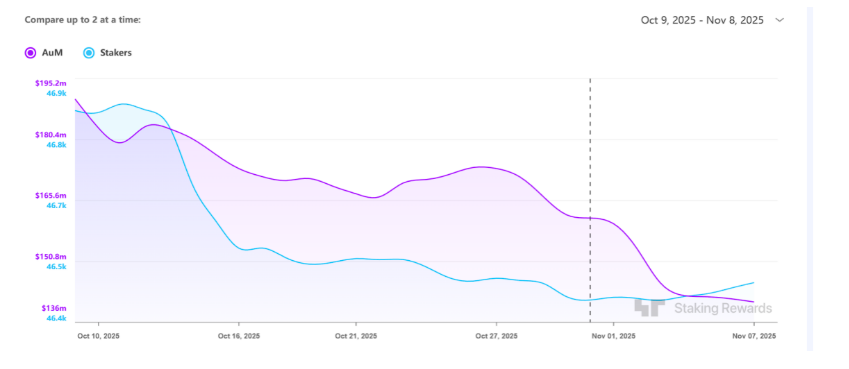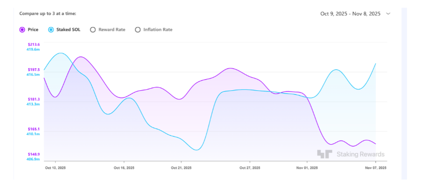 然而,与资金迅速涌入形成对比的是,SOL 短期价格表现相对平稳甚至在后续大幅回落。据 Trading News 报道,尽管 ETF 流入规模已超过 4 亿美元,SOL 的现货价格在随后的一个月内仍下跌约 29%。这种“资金流入与价格下行并存”的反差,引发了市场的广泛讨论。实际上,这一走势并非 Solana 独有,而是整个加密市场在宏观压力下的普遍表现。Decrypt指出,在同一时期,11 只比特币现货 ETF 的资产规模合计缩水逾 21 亿美元,9 只以太坊 ETF 也出现了累计 5.79 亿美元的净流出。美国政府关门风险上升、国债收益率飙升及全球流动性收紧,共同压制了风险资产表现。由此看来,SOL 的回调更像是宏观避险情绪的系统性反映,而非单一资产的结构性问题。与此同时,这一阶段的市场反应也揭示了 Solana ETF 与 BTC、ETH ETF 在结构逻辑上的本质差异。传统的比特币与以太坊现货 ETF 通常对应即时的现货买盘,资金入场会直接推动价格上涨;而 BSOL 的机制更接近“长期锁仓”,资金进入后被质押参与网络运行,其收益来源于链上奖励而非短期价格波动。换言之,尽管资金流入形成了结构性买盘,但传导至二级市场价格的节奏显著更慢。
