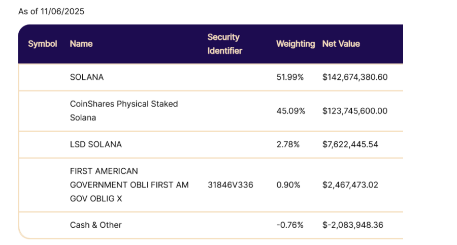SSK 的模式更为间接:约一半资产直接持有 SOL,另一半投资于瑞士上市的 CoinShares Staked Solana ETP,从而获得间接质押收益。对于自身持有的部分,SSK 委托外部验证者质押,并以现金形式定期向投资者派息,截至 9 月底,其分配率约为 5.1%。