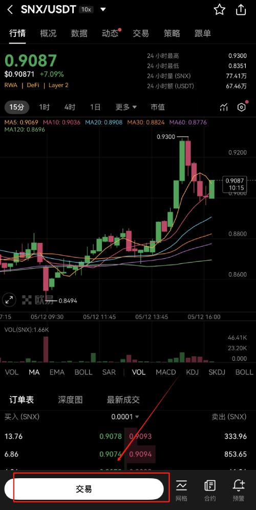3、这样可以进入SNX实时行情页面,点击左下角的“交易”按钮