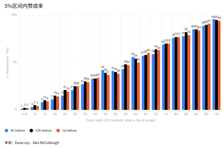 解读并不复杂。例如,被定价在60%区间的事件,最终约有60%的概率以“是”收场;被定价在80%区间的事件,根据截止时间前剩余小时数的不同,大约有77%–82%的概率最终实现。