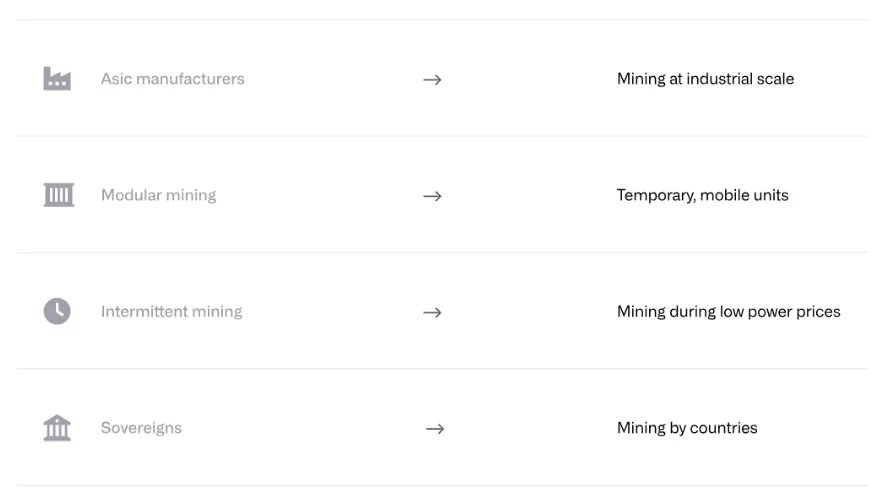 8、未来挖矿模式分化:传统工业级挖矿将被取代,未来挖矿将分化为四种模式:ASIC厂商自挖、模块化(临时)挖矿、间歇式(电网平衡)挖矿,以及主权国家挖矿。长期看,算力将由主权国家和ASIC厂商主导。
