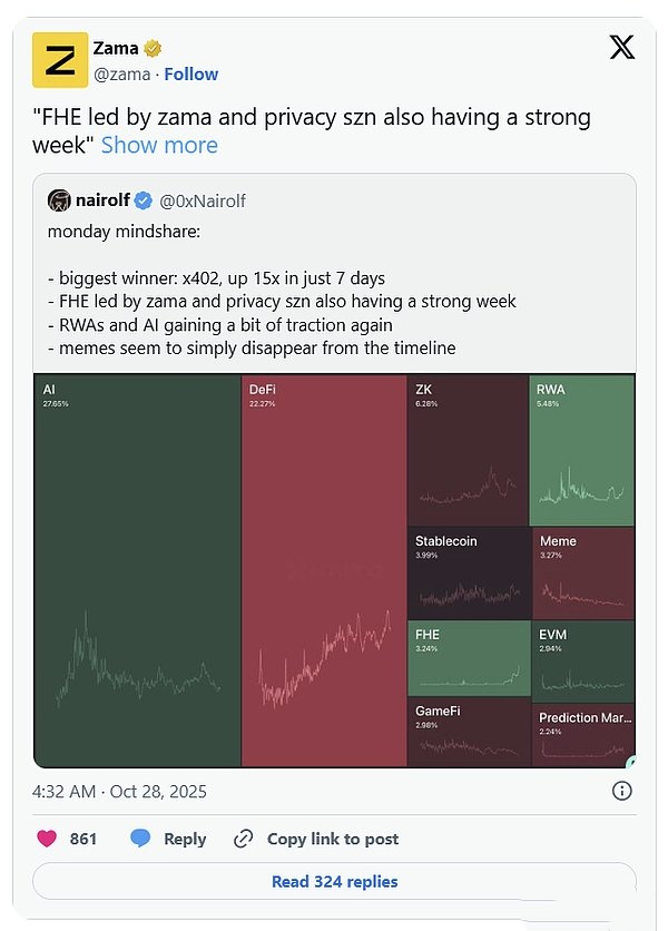 近期最受关注的莫过于FHE协议Zama即将发币的消息,让整个加密圈再次把目光聚焦在这一被誉为“隐私计算最终形态”的赛道上。Zama在短短一年内吸引多家顶级机构入局,在AI、DeFi、数据共享等领域不断拓展合作版图,其机制与生态布局也被视为FHE真正大规模应用前的重要模板。