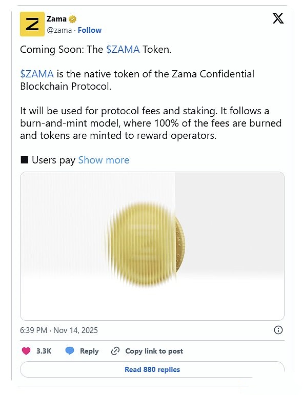 ZAMA代币即将推出,并将作为该协议的原生功能型代币。它在网络中承担三大核心职能:通过质押保障运营安全、支付协议使用费用、实现对协议参数的治理权。