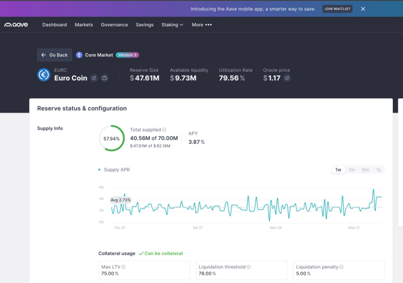 回到汇率对冲策略来说,笔者认为一个切实可行的策略是将美元稳定币兑换为EURC,然后可以选择存放到AAVE等头部平台赚取利息,以当前利用率来看,出借利率可以达到3.87%,也是比较香的。如果想保持对BTC等风险资产的头寸,又想对冲汇率风险,可以选择以EURC作为抵押品,借出美元稳定币,再进行资产配置,例如购入BTC。