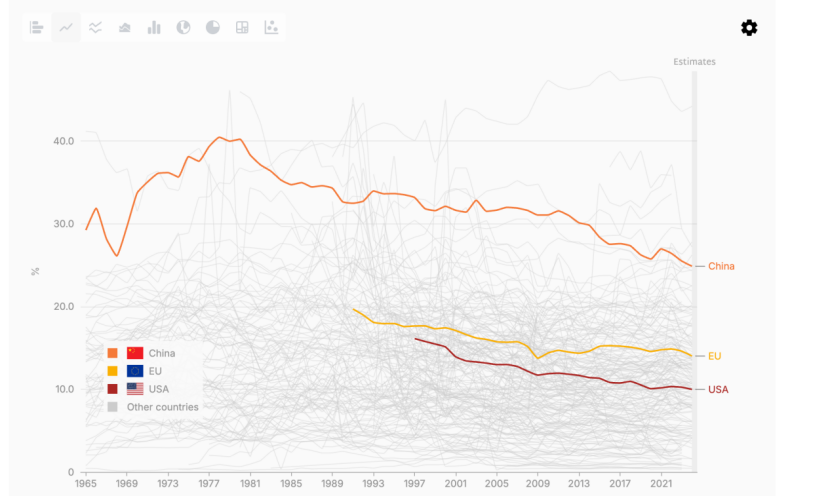 当然汇率风险也在于如何解决与欧盟的政治摩擦。由于欧盟各国大多数为已开发国家,且制造业在GDP占比远比美国来的更高(欧洲制造业占GDP比例达到15%,而美国则为不到10%),这就意味着欧洲普通民众的主要收入中工资收入,相对于投资带来的资本利得的占比更高。在过去一段时间內,欧盟由于失去了俄罗斯廉价的能源供给,导致成本攀升,制造业受到了不小的影响,特别是由于中国的产业升级,对欧洲的支柱型产业之一,汽车产品产生了极大冲击。这就意味着欧洲整体产业利润的下降,企业利润的下降带来的两个影响是政府税收的下降,以及工资增速的放缓。前者也会通过财政吃紧,进而影响欧洲原有的高福利的维持。这两者都将使得居民的财富效应降低,进而影响消费。而投资方面,由于缺乏AI方面的优质标的,欧洲失去了在AI领域的资本竞争能力,欧洲资本大都流出到美国的AI市场中,以争取更高的预期回报。因此投资方面也不容乐观。所以在这个基础上,净出口对于经济的影响就会被放大,因此欧洲各国政府对贸易逆差的态度也更为激烈。