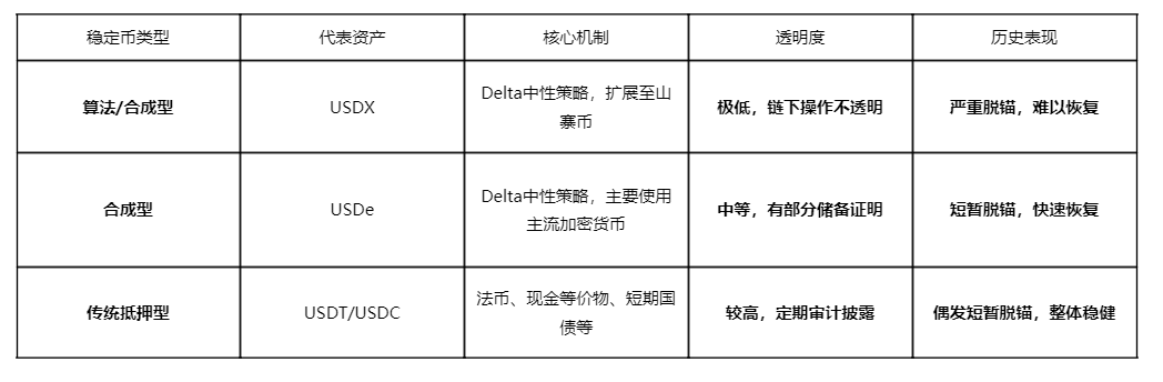 将USDX、USDe与USDT、USDC等传统稳定币进行比较,我们可以清晰地看到一条安全性的脉络。