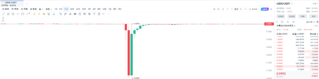 USDX并非首个面临脱锚风险的合成稳定币。就在不久前的10月11日,全球第三大稳定币USDe曾一度跌至0.65美元,较1美元兑价下跌约34%。