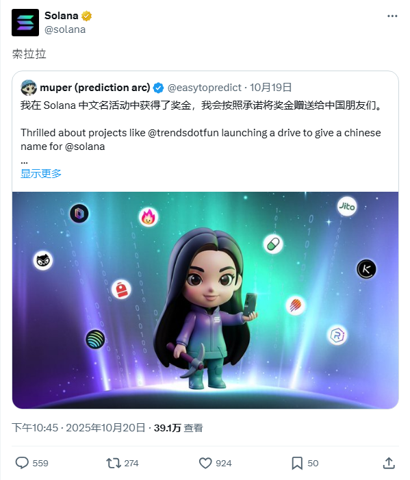 据悉,本次“为Solana征集中文名”活动由Trends.fun举办,“索拉拉”名称由X用户muper( easytopredict)提供,他从Solana基金会主席Lily Liu的帖子中汲取了灵感。