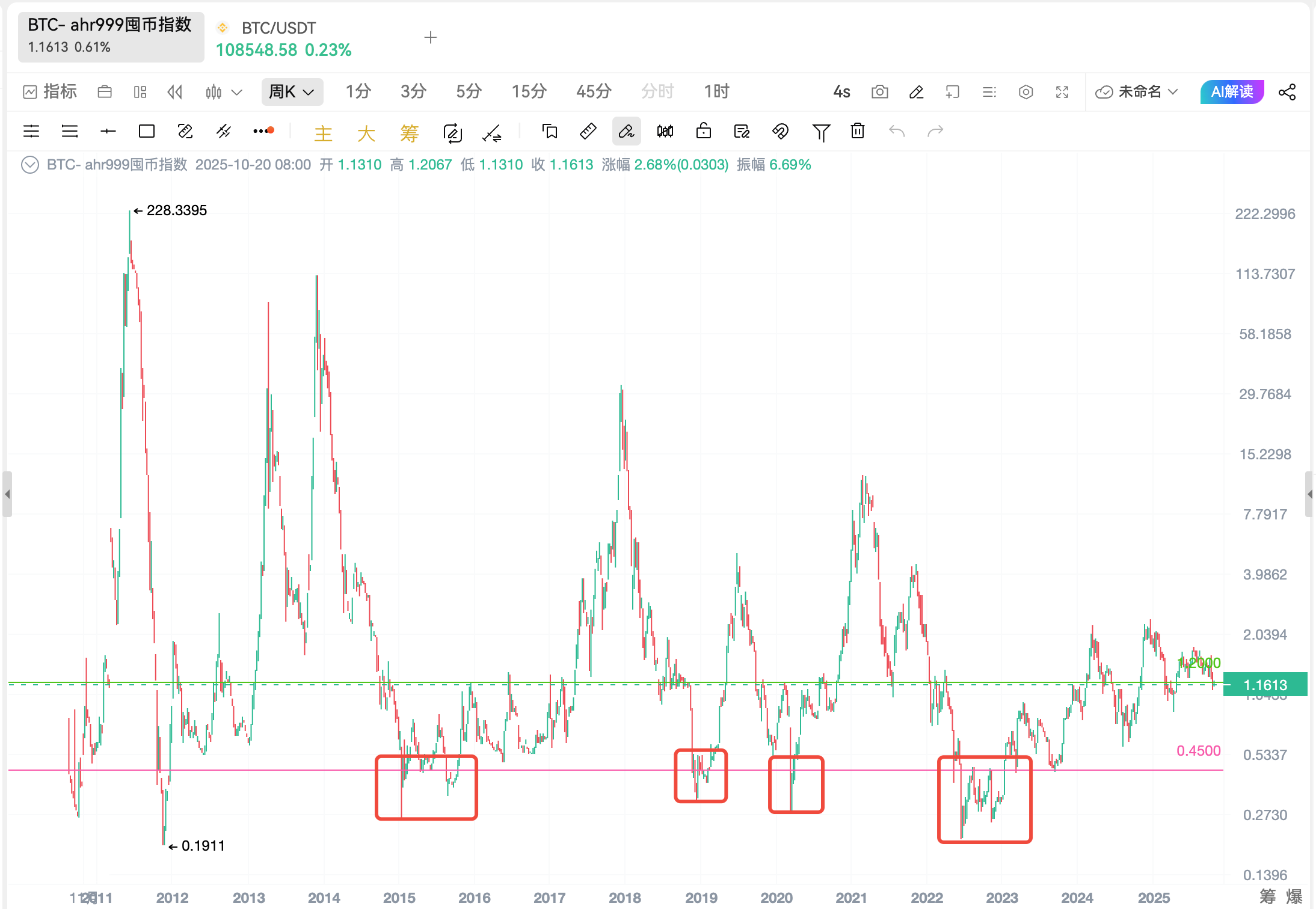 在过去多个周期中,AHR999 < 0.45 时,几乎都对应了极佳的长期买入时机(比如 2015 年、2018 年末、2022 年底的几次低点);而当 AHR999 超过 2.0,往往伴随市场情绪亢奋、牛市后期见顶。