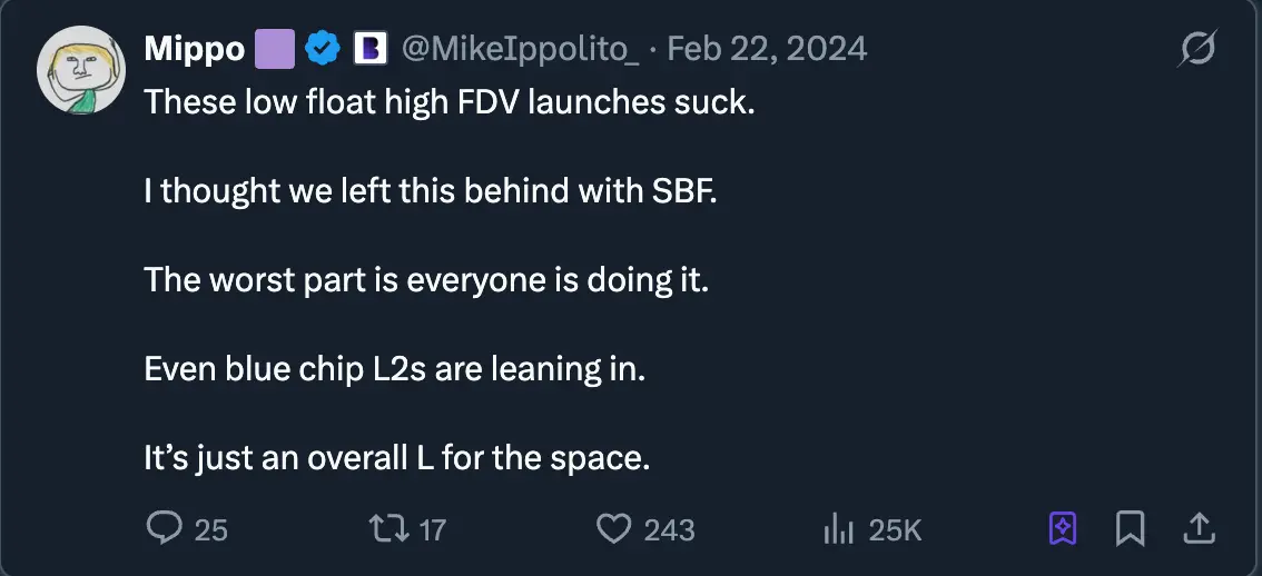 结果不出所料。这些代币在上线时价格飙升,但随着解锁期的到来和内部人士的退出,价格迅速下跌。Cobie 的名言——“拒绝购买虚高的 FDV(完全稀释估值)代币”——从一个网络梗变成了风险评估的框架。做市商拉大了买卖价差,散户干脆不再参与,许多此类代币的行情在接下来的一年中几乎没有任何起色。