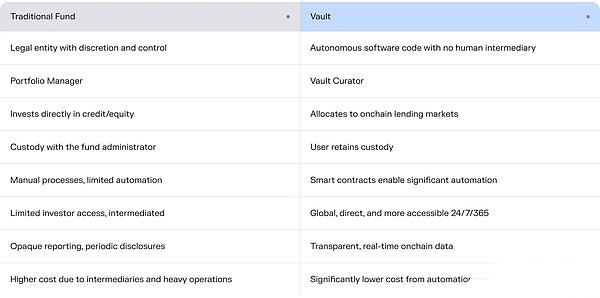金库基础设施存在于一个连续谱系中。一端是完全基于链上的金库,例如Morpho金库,其中不可篡改的智能合约确保了强大的安全保障:用户保留资产控制权,资产分配透明且可验证,所有变更都通过时间锁进行。另一端是金库“包装器”,它们维持着更为传统的托管安排,金库运营者控制资产,并对资产使用方式拥有完全的决定权。