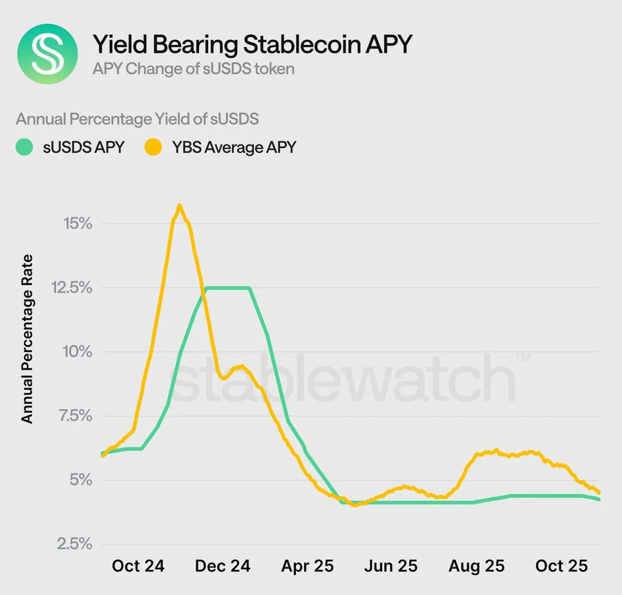 该类别主要分为三个子类型。其中第一子类是收益包装(Wrapper)模式,如Sky Protocol的sUSDS。用户将USDs等非生息稳定币存入协议,即可获得随协议收入累积增值的代币sUSDS。sUSDS持有者的收益由整个Sky Protocol生态系统产生,主要来自借款人支付的稳定费,以及至关重要的,协议自身数十亿美元RWA投资产生的收益。