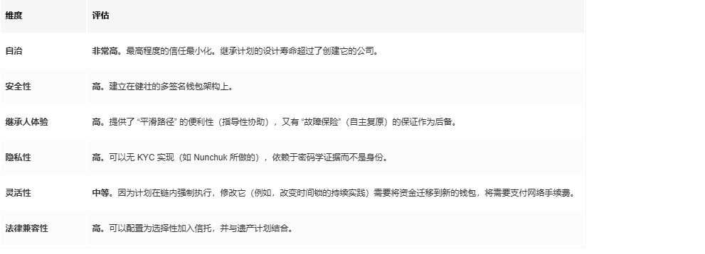 结论:最优的平衡。这种方法消除了链外解决方案的 “弹性间隙”,提供了最高程度的自主性和隐私性,而无需牺牲安全性和继承人体验。
