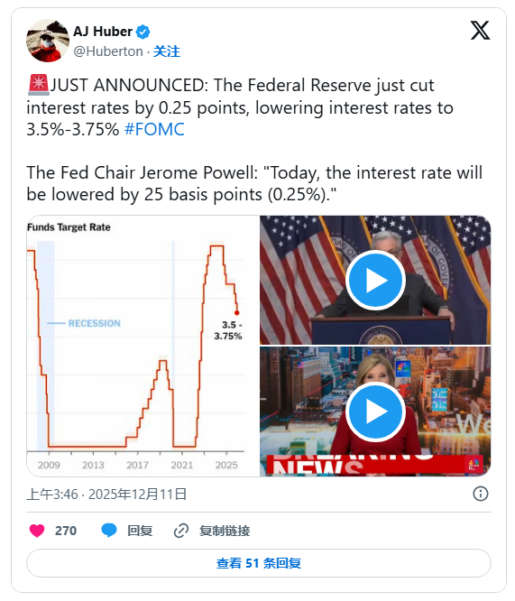 美联储周三的这次降息,是连续第三次下调利率,交易员们现在基本把它当成迈向2026年潜在宽松周期的起点。