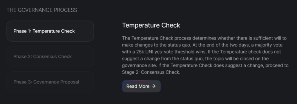 区块链智能合约构成了DAO的支柱,允许对投票进行统计,并在某些情况下自动释放资金。在最终投票之前,DAO通常采用几个步骤。以下Uniswap DAO的屏幕截图详细介绍了治理流程,包括: