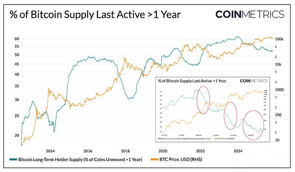 如今,比特币1994万枚流通供应量中约有52%已闲置一年以上,低于2024年初的约61%。熊市期间的大幅增长和牛市期间的大幅下降均已明显缓和,2024年第一季度、第三季度以及2025年近期都出现了渐进式的分配。这表明长期持有者正在以更持续的方式分配比特币,反映出所有权的更长期转移。