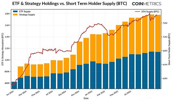 ● 自2024年初以来,现货比特币ETF和Strategy等DAT已吸收了短期持有者供应量增长的约57%,目前占过去一年所有活跃比特币的近四分之一。