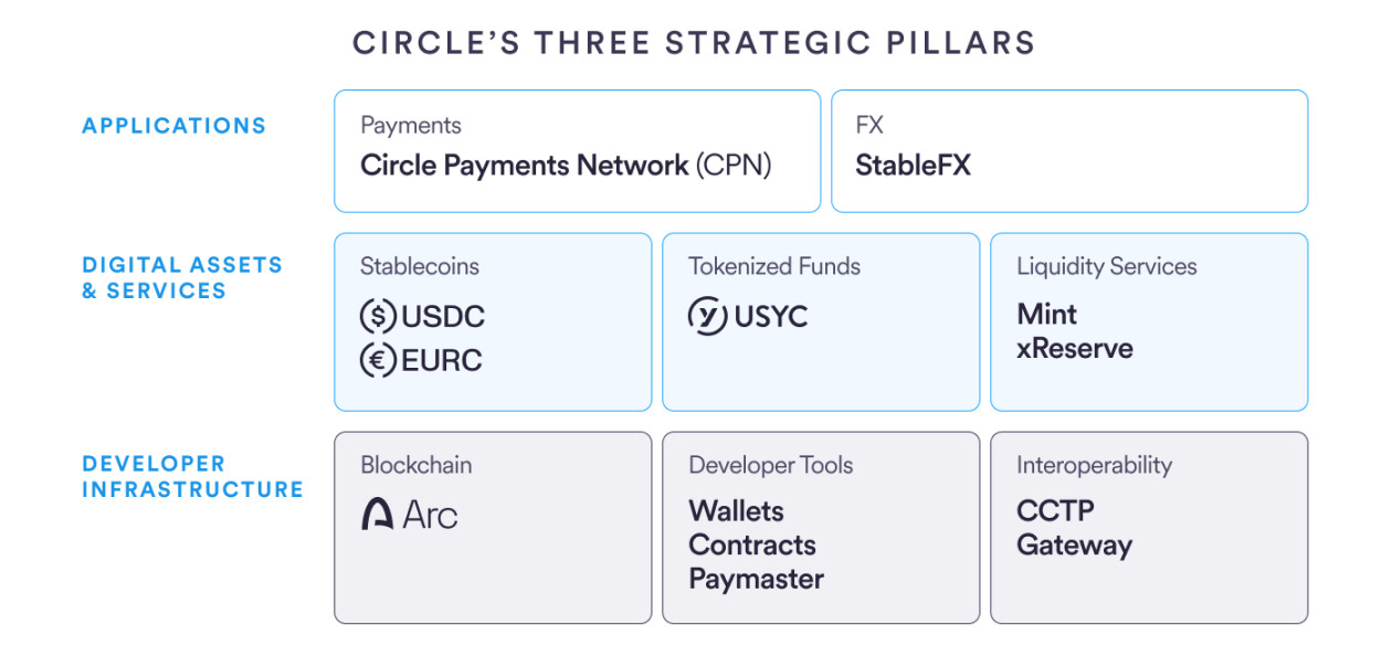 ● Circle在2025年完成全栈平台构建,结合了可信的数字资产(USDC、EURC、USYC)、现实世界的应用以及Arc区块链,以此作为互联网的经济操作系统。