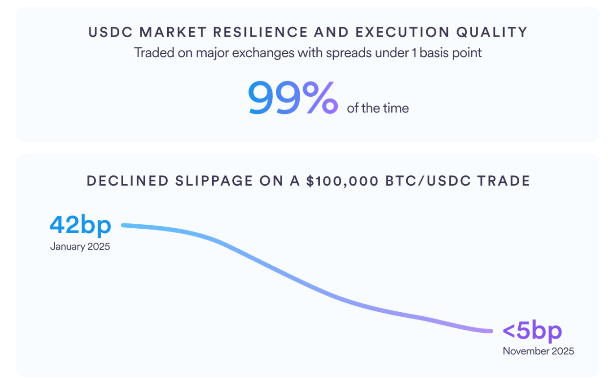 市场流动性在过去一年显著提升,币安BTC/USDC现货流动性增长227%,永续合约深度提升超200%。交易指标优化,99%时间点差低于1基点,10万美元交易滑点从42基点降至不足5基点,逐步缩小与USDT差距,成为高可信度流动性载体。
