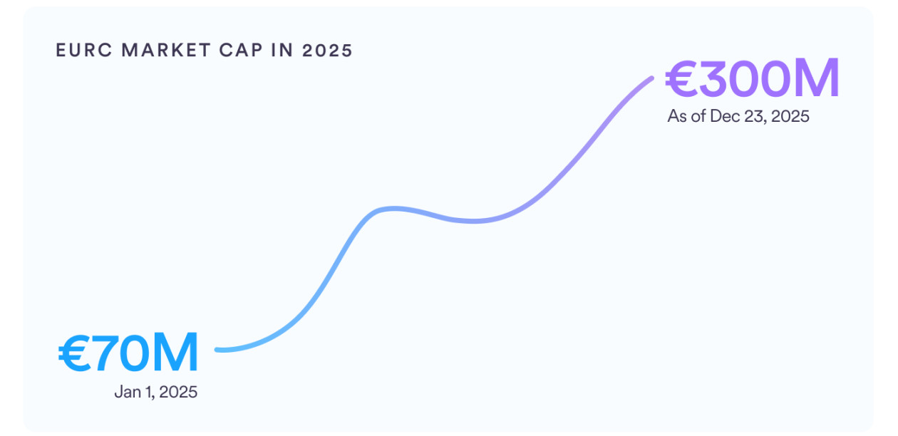 2025年对EURC而言也是至关重要的一年。MiCA落地驱动EURC爆发式增长,截至12月23日市值从7000万欧元升至超3亿欧元,增长328%,稳居欧元稳定币榜首。