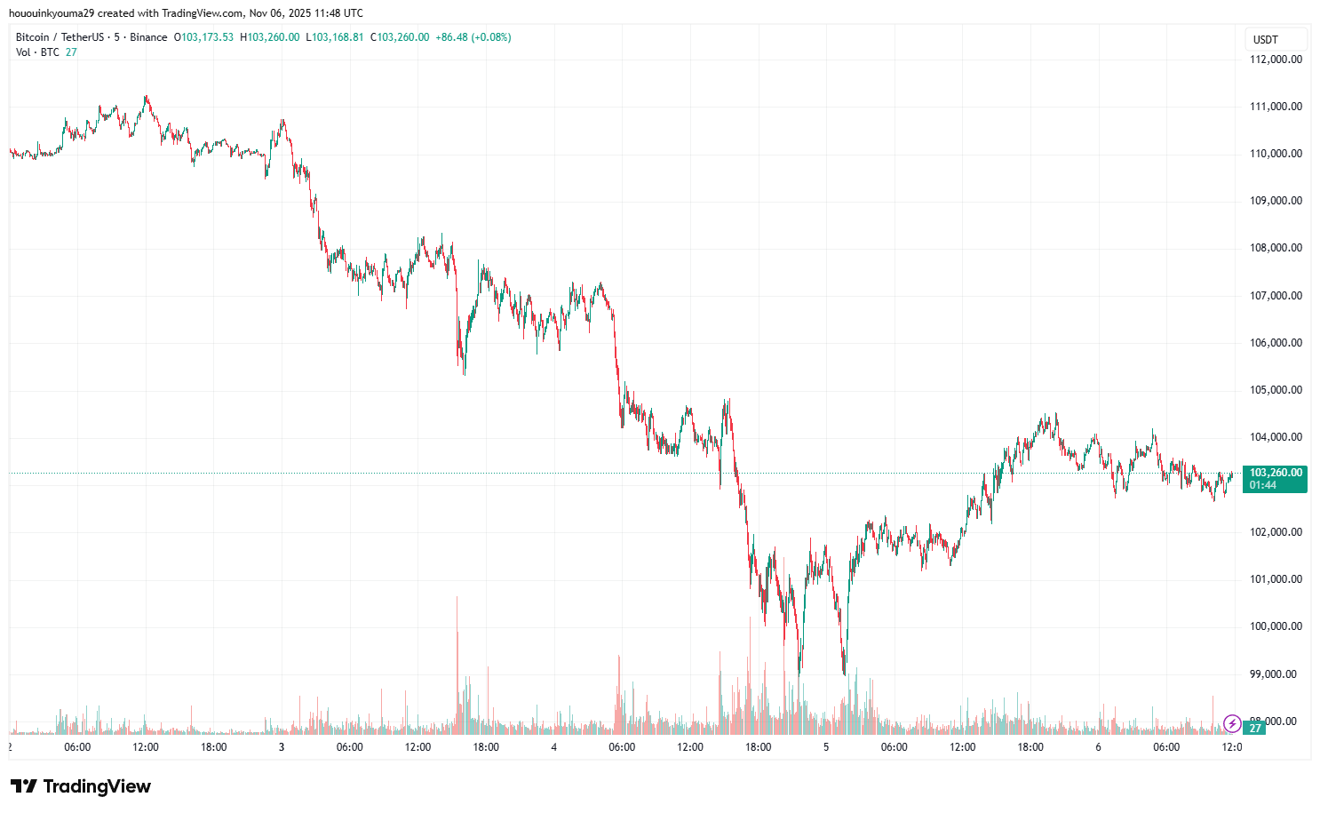 截至发稿时,比特币价格在 103,300 美元左右波动,过去七天下跌超过 6%。