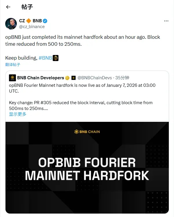 CZ在X平台发文表示,opBNB主网硬分叉已完成。此次升级将区块时间从500毫秒减少至250毫秒。