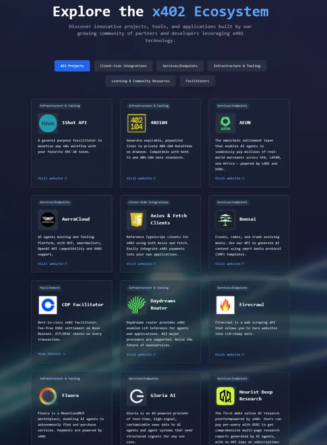 在 x402 协议的官网上的 Ecosystem 页面有着当前的项目汇总。如果一个一个项目点进去查看的话,会感觉到这个协议仍然处在一个相当早期的发展阶段。点进去直接是技术文档或跳转到 Github 的项目也不少。