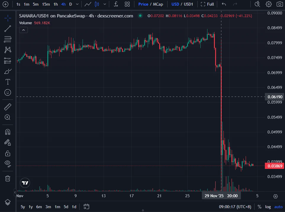 11月29日晚,Sahara AI的代币SAHARA短时间内跌幅超过50%,价格此后也未能明显修复,现报0.03869美元。