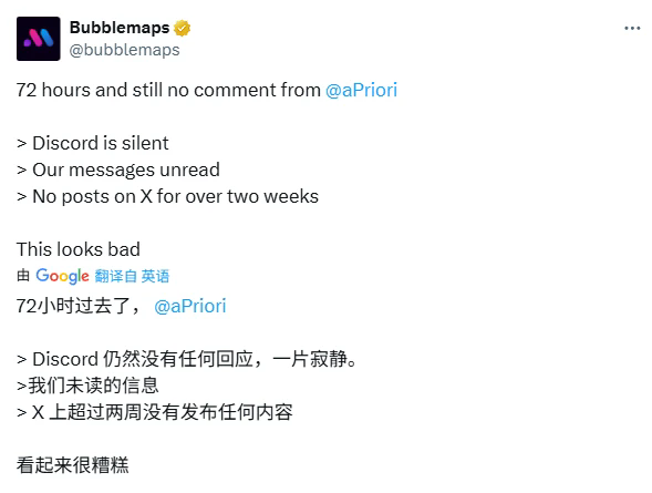 然而,比数据本身更让社区不满的是——项目方完全不回应。11月14日,Bubblemaps表示他们早已联系aPriori团队,寻求就“60%空投被同一实体通过1.4万个地址领取”的情况给出解释,但截至目前仍未收到回应。