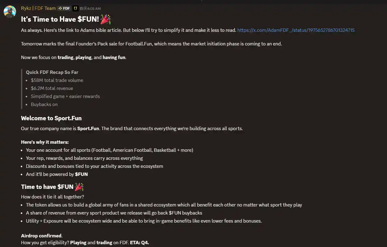 10月9日,据Base链上体育预测应用Football.Fun官方消息,其母公司Sport.Fun将于Q4推出代币$FUN并预计将在Q4进行空投,该代币将享受公司旗下预测市场收益分成。