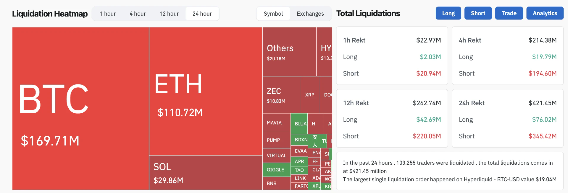 衍生品交易方面,Coinglass 数据显示,过去 24 小时全网爆仓 4.21 亿美元,其中绝大部分为空单爆仓,数额达 3.45 亿美元。从币种来看,其中 BTC 爆仓 1.697 亿美元,ETH 爆仓 1.107 亿美元。