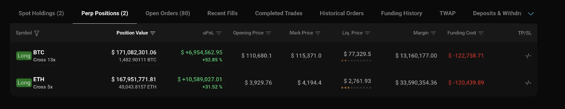 HyperBot 数据显示,“10.11 至今胜率 100%巨鲸”目前持有的 13 倍 BTC 多单和 5 倍 ETH 多单已浮盈约 1754 万美元,且暂时仍未止盈,三小时前该巨鲸甚至还追加建仓了 1868 枚 ETH 多单。目前,该巨鲸的持仓总价值约 3.39 亿美元,其中 BTC 多单价值约 1.71 亿美元,开仓价为 110680 美元;ETH 多单价值约 1.68 亿美元,开仓价为 3929 美元。