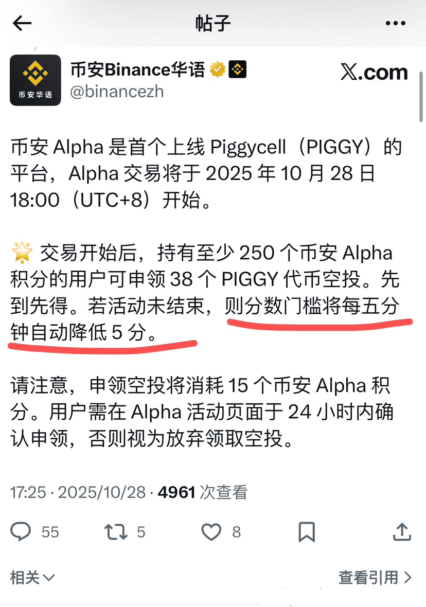今天出了个每5分钟降低5分的模式,让之前完全抢不到的散户们,现在只要分够就能抢到。治理之后相对公平 很多,分数低的人终于迎来了曙光!有人说利好高分,其实现在这种状态要想刷高分成本是很高的,大部分人还是每天16-18这种分数,只有少部分人花高成本去拿更高的分数,因此大家的分数都差不多的情况下基本上都能保证吃到肉。Alpha新规的实施,既是监管的进步,也是加密市场向大众投资者开放的重要一步,为小散户创造了更多获得收益的可能性。