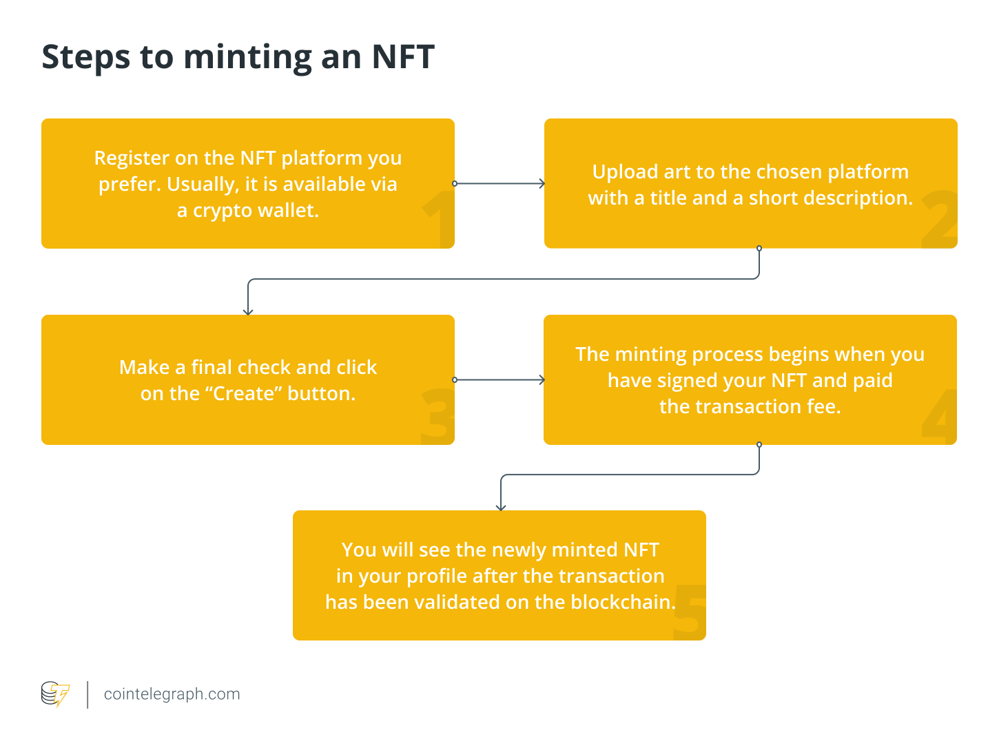 不需要编程,就可以很容易从数字艺术中创建NFT。创建它们的过程被称为铸造(mint)。这一过程基本上就是在区块链上发布一枚独特的代币的过程。创造NFT就意味着NFT被铸造出来了,类似于铸造硬币并进入流通。