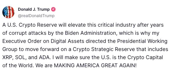 特朗普在帖子中表示,该储备将有助于“在拜登政府多年腐败攻击之后提升这一关键行业”。他解释说,他的数字资产行政命令指示总统工作组推进储备计划,并将“XRP、SOL和ADA”列为该计划的一部分。