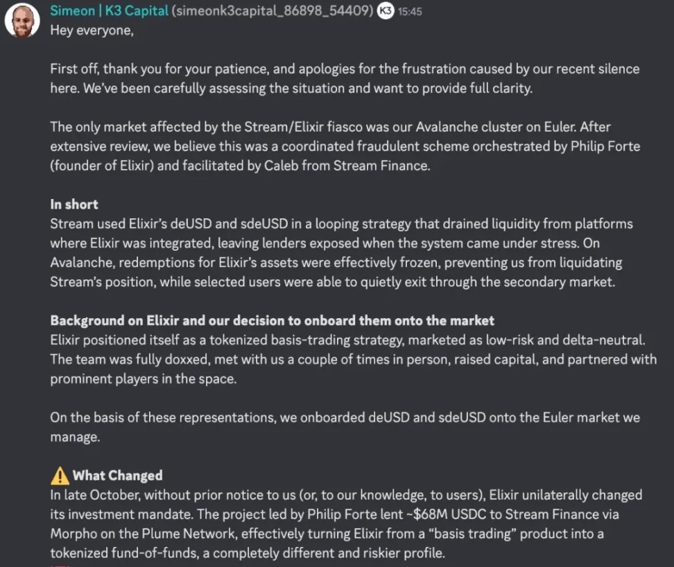 当Stream的坏账在11月3日公开后,K3立刻联系Elixir的创始人Philip Forte,要求保障能够1:1清算deUSD。但Philip选择了沉默,完全不回应。在无奈之下,K3只能在11月4日强行清算,手上留下了200万美元的deUSD。Elixir在11月6日宣布资不抵债,它的解决方案是散户和流动性池里的deUSD可以1:1兑换成USDC,但Curator金库里的deUSD不给兑换,要求大家一起协商解决。