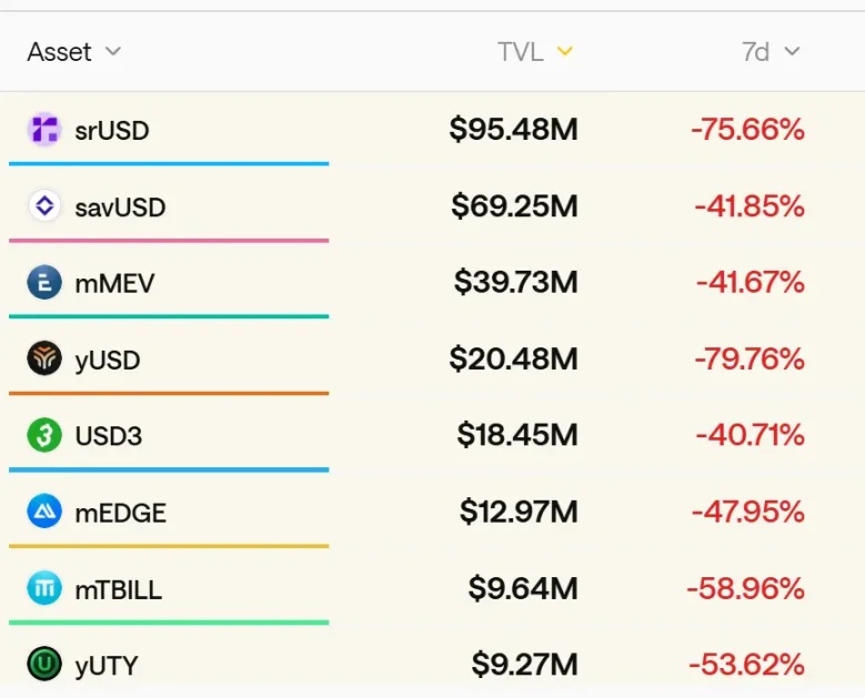 恐慌迅速蔓延。根据研究机构stablewatch的数据,在接下来的一周内,超过10亿美元的资金从各类「派息稳定币」中仓皇出逃。这相当于一个中型城市商业银行的全部存款在7天内被挤兑一空。