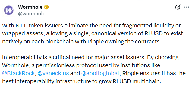 Wormhole团队补充道:“有了NTT,代币发行方无需分散流动性或包装资产,即可在每个区块链上原生存在一个单一的、规范的RLUSD版本,而Ripple拥有这些合约。”