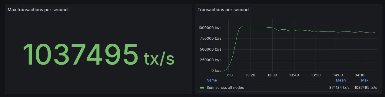 NEAR发布了基准测试脚本、运行期间使用的提交哈希值,以及包含完整性能跟踪信息的公开Grafana仪表板。仪表板显示,该网络在保持稳定区块生产的同时,突破了100万TPS的阈值。