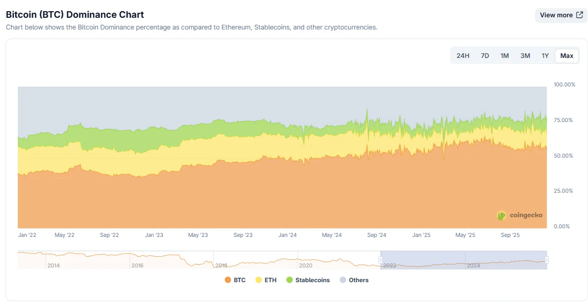 撸毛收益本质上依赖于空投代币的后续表现,而空投价值的放大往往离不开“山寨季”的东风——那段山寨币集体轮动、百倍暴涨的黄金窗口。然而整个2025年,加密市场陷入了持久的BTC独大格局,山寨币整体低迷。根据链上数据,BTC的市值占比持续上涨,今年最高一度触及63%。BTC独大意味着流动性不外溢,山寨不轮动,新项目更难起势——没有价格放大器,空投价值就涨不起来,撸毛收益也就注定走弱。