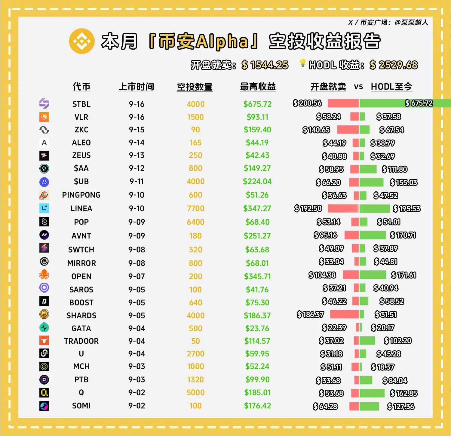 尽管用户激增,但收益却呈现“僧少肉多”的局面。根据加密KOL泵泵超人9月17日发布的币安Alpha收益报告,9月2日至9月16日的26个空投项目中,收益最高的项目是STBL,开盘卖出价值为200美元,若持有至9月17日,价值高达675美元。若将这26个项目都持有至9月17日,总价值为2529美元;即便全部在开盘卖出,也可获得1544美元。