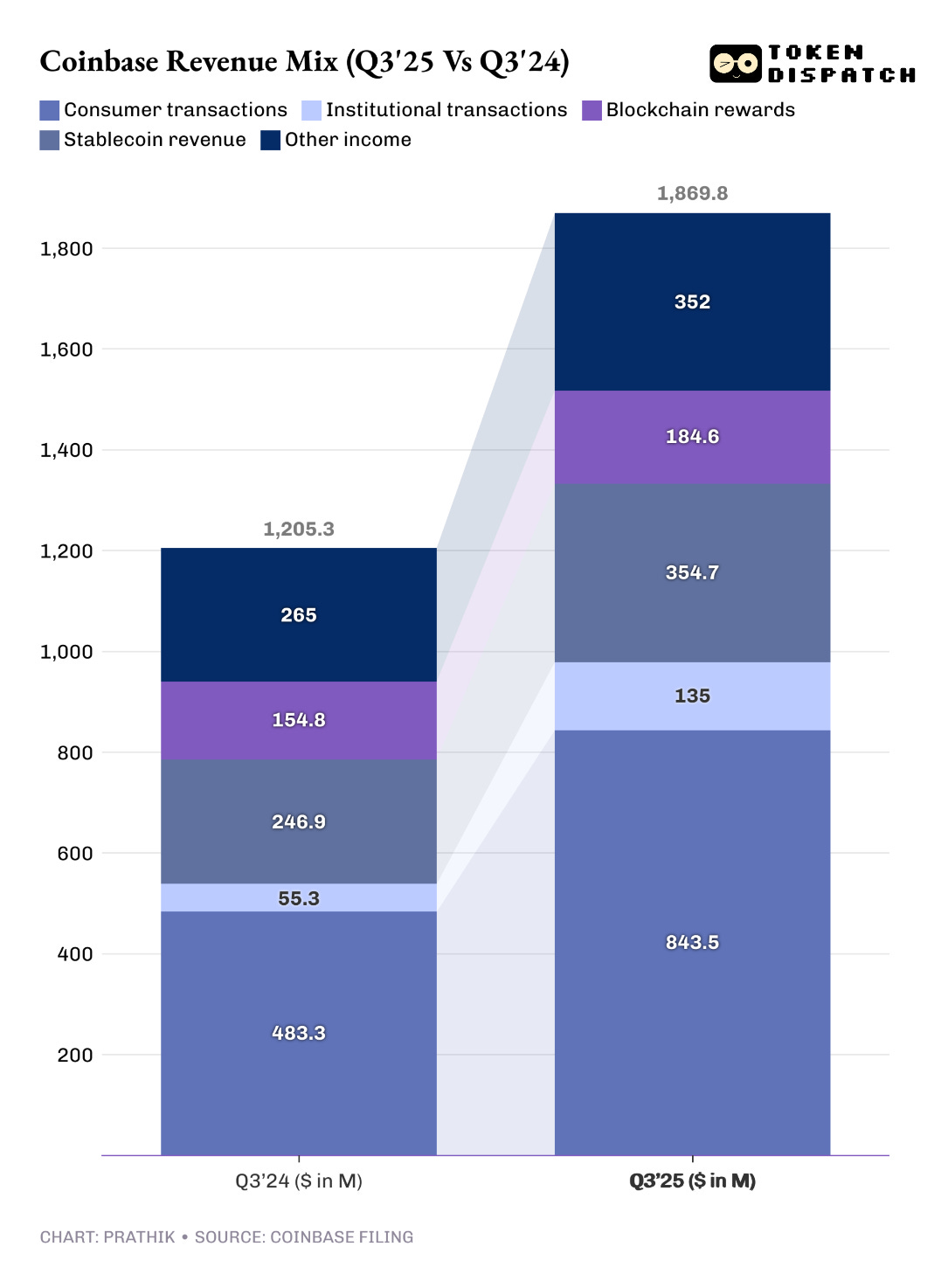 多年来,Coinbase被冠以诸多头衔:美国加密货币监管的典范、散户投资者的入门之选以及拥有梦幻般上涨潜力的加密货币股票。当我深入研究其截至2025年9月30日的季度业绩时,我发现它最大的优势并非在于其交易本身,而在于它构建的生态系统以及它在这个生态系统中促成的价值流动。