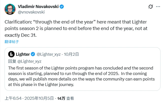 Lighter 创始人:第二季积分活动将在年底前结束,而非12月31日