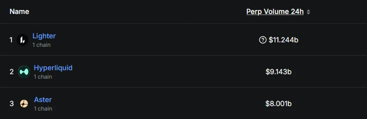 受此消息影响,尚未发币的Lighter一时间成为“撸毛党”眼中最值得刷交易量的Perp DEX项目。DefiLlama数据显示,Lighter 24小时交易量突破110亿美元,已位居Perp DEX首位,紧跟其后的是Hyperliquid(91亿美元)、Aster(80亿美元)。