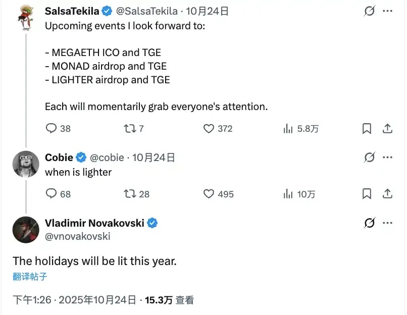 上个月中旬,Lighter 创始人兼 CEO Vladimir Novakovski 在 YouTube 的一场俄语 AMA 中表示,第二季积分活动将持续至 TGE。结合他此前在 X 平台上提到的“积分活动会在年底前结束,但不会持续到 12 月 31 日”,以及他近日对社区成员留言“the holidays will be lit this year”(今年的假期将会很精彩),让空投时间的预期更加明朗。