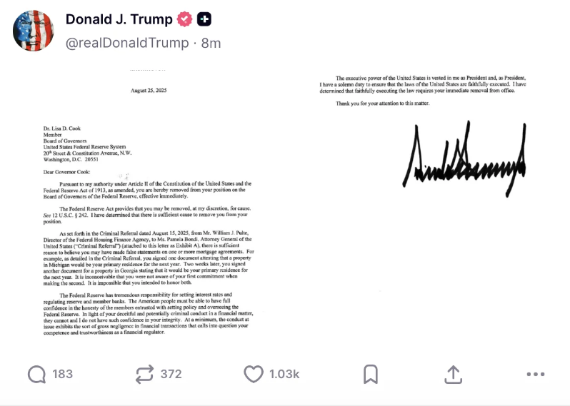 罢免反对派理事丽莎·库克,则是为了腾出至关重要的第四个席位。一旦成功,特朗普将能够任命四名自己人,在七人理事会中占据多数。