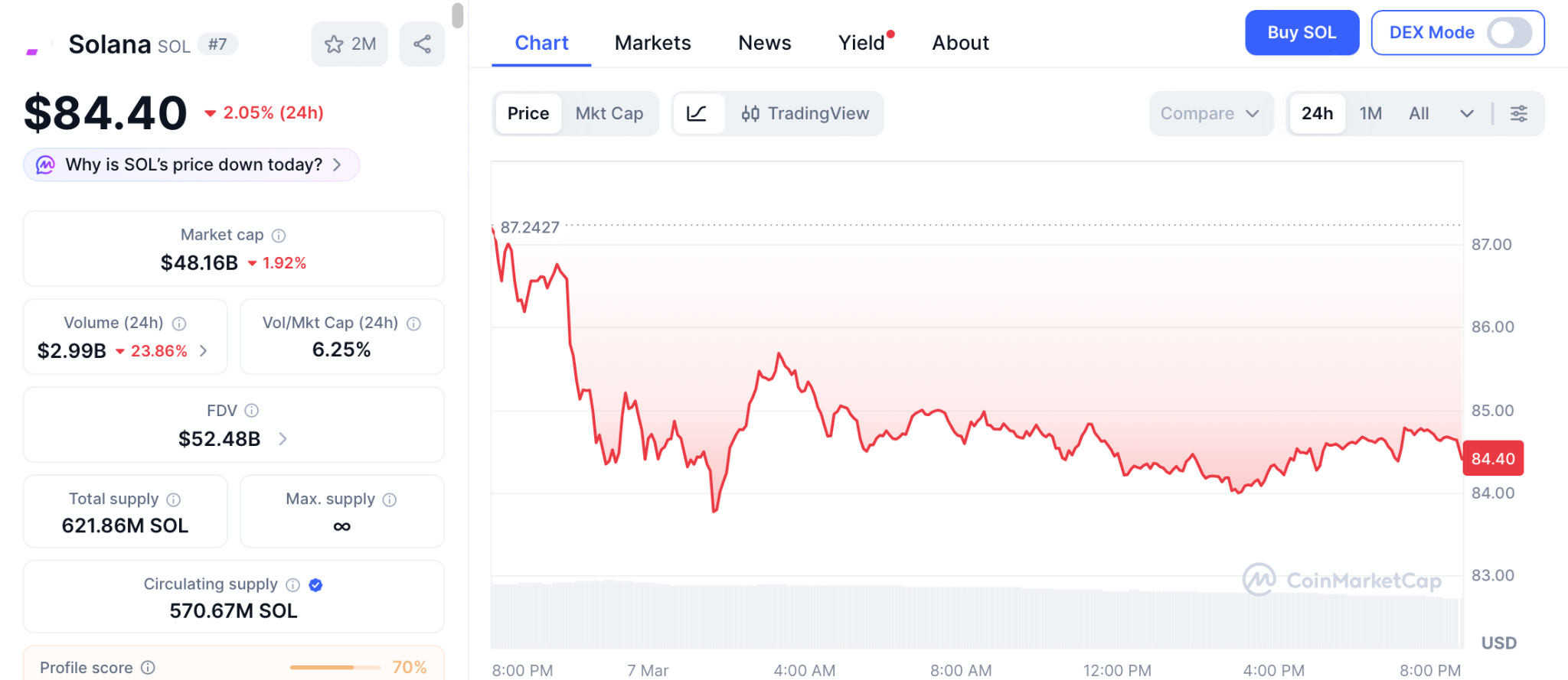 据CoinMarketCap数据显示,SOL在未能维持周中的复苏后,于周末前下跌4%至约84美元。