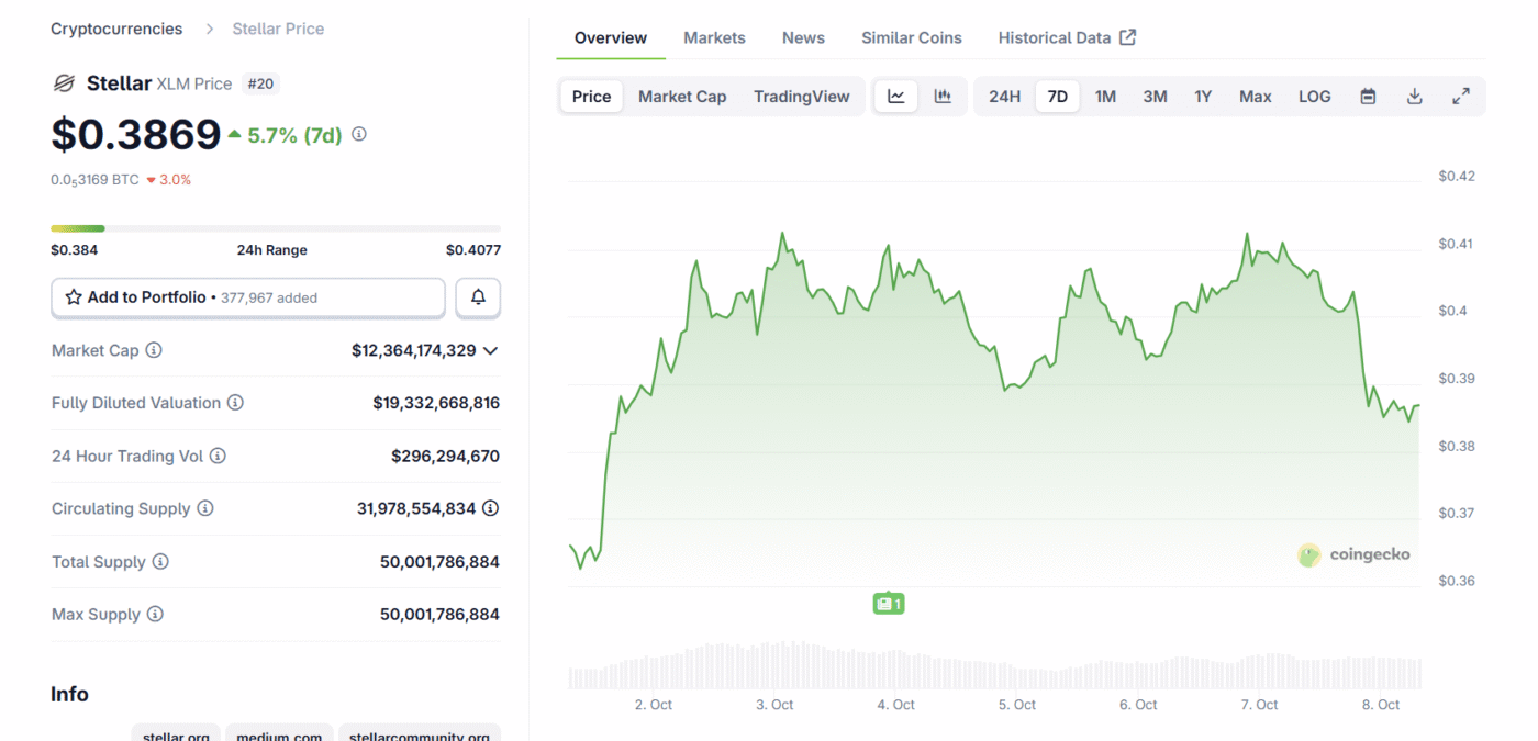 当前XLM价格在0.38美元附近呈现胶着状态,过去几个交易日高点触及0.41美元,低点下探0.38美元。分析师观点出现分歧:部分认为0.36美元形成支撑位,另一派则预期突破0.43美元后将冲击0.48美元目标。尽管处于窄幅震荡,稳定交易量显示市场参与度未减,十月底前仍存上行潜力。