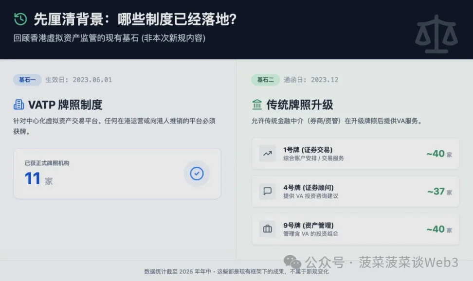 在解读本次文件之前,有必要回顾香港虚拟资产监管的现有框架。以下制度已经生效,并非本次文件的新内容:
